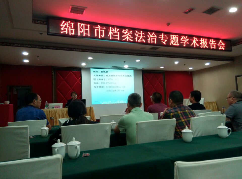 今年是《中华人民共和国档案法》颁布30周年。为认真搞好纪念活动,2017年9月7日下午3:00—5:00,由市档案局主办、市档案学会承办的档案法治专题学术报告会在绵阳新华饭店召开。本次学术报告会的主题是认真学习贯彻《档案法》,持续提升依法治档水平;主讲人是四川省档案局法规处处长张晓芳。